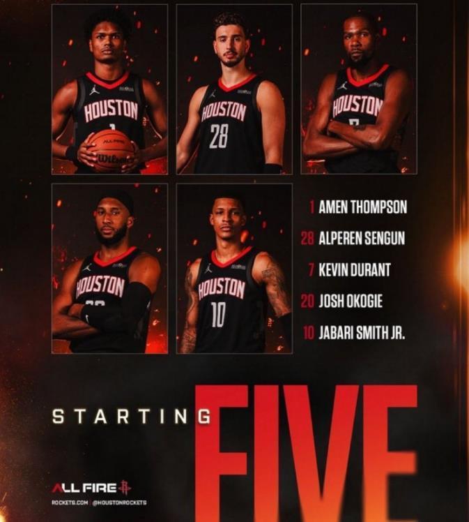火箭队本场的首发阵容分别是阿门·汤普森、奥科吉、杜兰特、小史密斯和申京,和前一场没有什么变化。但第二阵容有一些调整,5位球员出战,分别是后卫谢泼德、戴维森,以及前锋多利安·芬尼-史密斯、泰特和中锋卡佩拉。两套阵容看起来非常齐整。